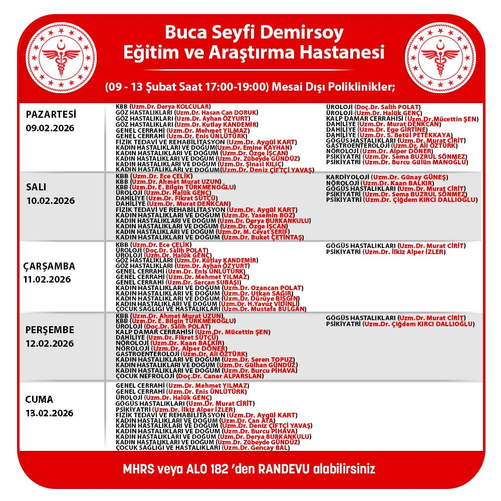 Vatandaşların sağlık hizmetlerine daha hızlı ve kolay erişimini sağlamak amacıyla Buca Seyfi Demirsoy Eğitim ve Araştırma Hastanesi, 09–13 Şubat 2026 tarihleri arasında mesai dışı poliklinik hizmeti sunacağını duyurdu.